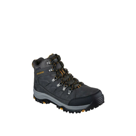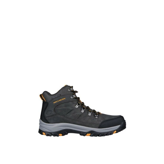 Adventure in rugged comfort and support with Skechers Relaxed Fit: Relmont – Daggett. This lace-up outdoor trail design features a water-repellent synthetic and mesh upper with a cushioned Skechers Air-Cooled Memory Foam insole.