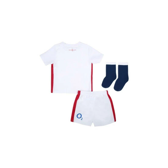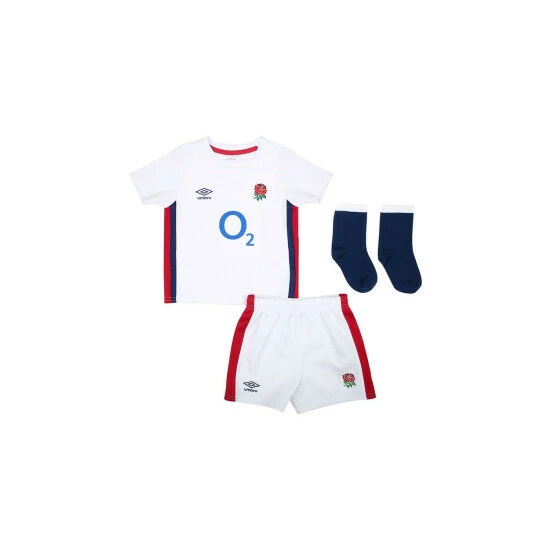Suit up your little one to join in the fun, with the England Home Replica Baby Kit, the ideal way to inspire a new generation of England fans. Made from a textured fabric and styled with a squared neckline and contrast side panels, detailed with contrast taping. Finished with the George Cross heat applied back neck sign off, woven licensed label to side seam, and heat applied Umbro diamond and applique silicone crest to the chest. The shorts are styled with the matching contrast side panels and finished with the Umbro diamond logo and the England Rose club crest. The contrast socks echo the colour blocking of the adult versions with the Umbro logo knitted into the front.