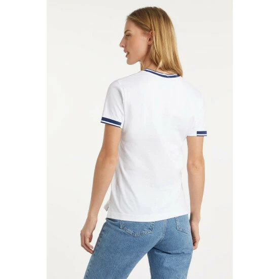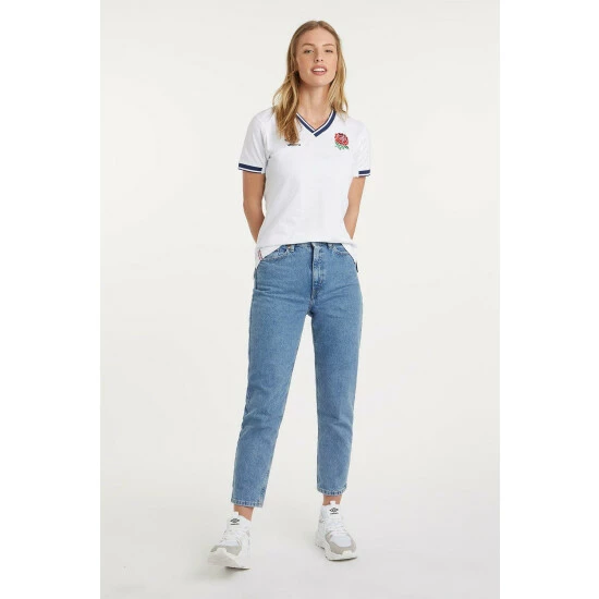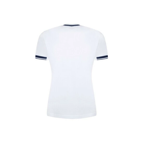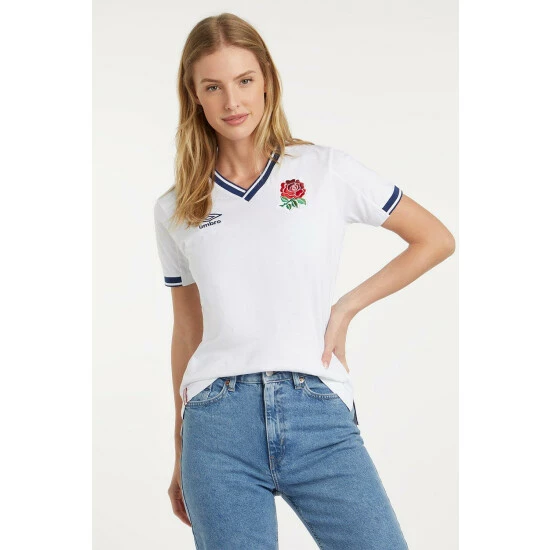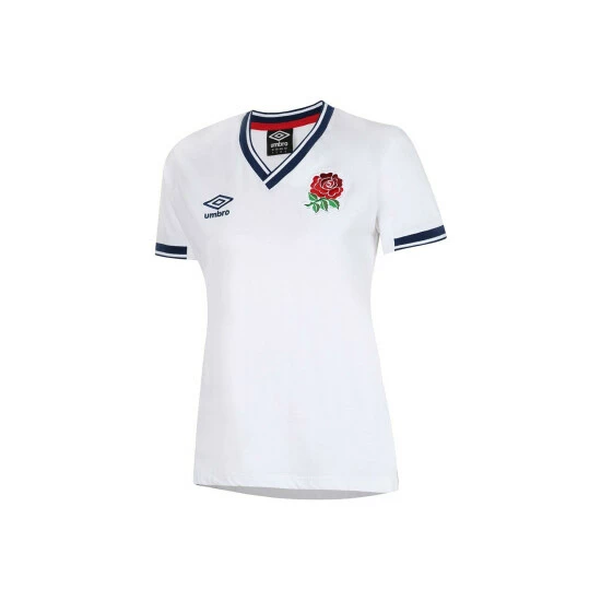 The perfect t-shirt to wear supporting The Lions, the England Classic Contrast Rib Tee, sports a stylish rib V neck and cuff tipping detail in navy, which looks sharp against the crisp white jersey. Designed with underarm panels, a stepped hem with contrast herringbone taping and finished with an England – Umbro grosgrain loop label to the hem and the England Rugby Rose and Umbro diamond logo embroidery to the chest.