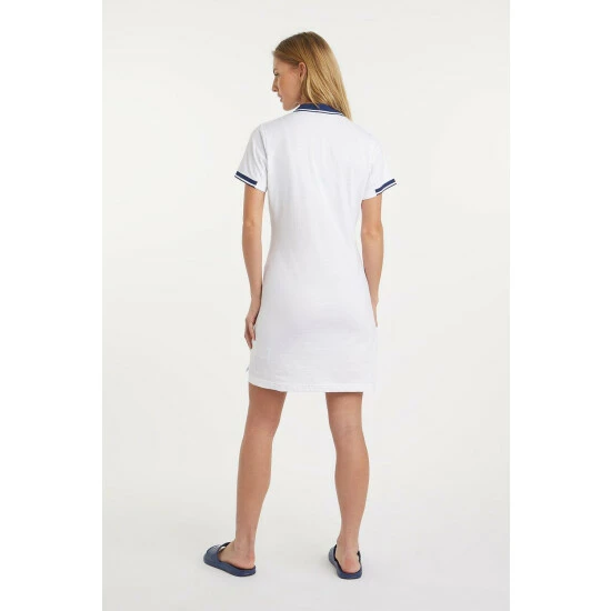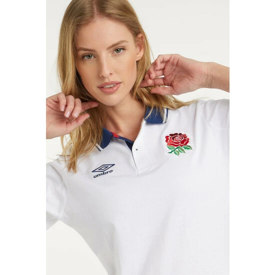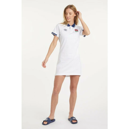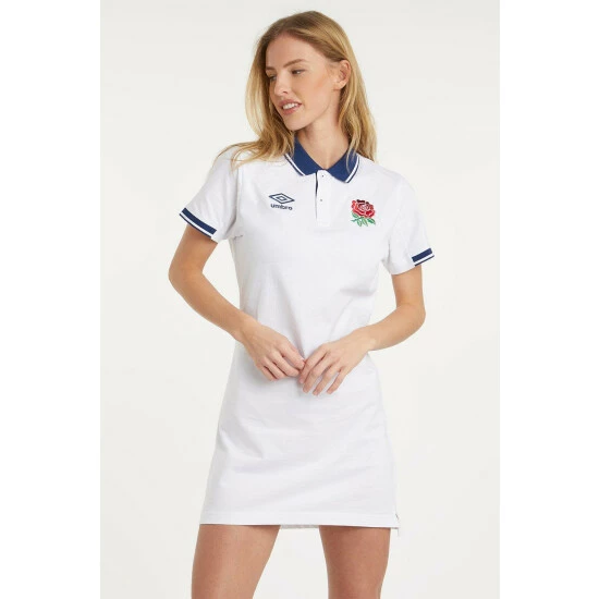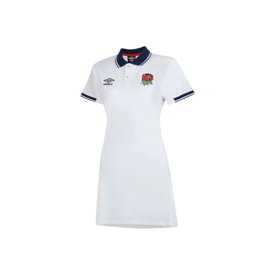 This flattering England Classic Polo Dress is an iconic, wearable style that nails the preppy look perfectly. Made from 100% cotton jersey, with underarm panels, the rib trims and contrast collar, complete with tipping detail, are enhanced with a touch of stretch to keep them looking smart. Styled with a 2 button placket and contrast stitching on the branded buttons, the stepped hem sports contrast herringbone taping, which also features on the back neck. Finished with embroidered England Rugby Rose and Umbro Diamond Logo to the chest.