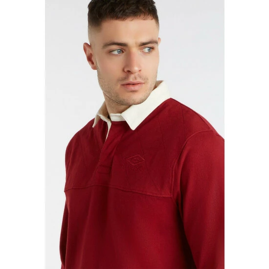 A classic long sleeve rugby shirt that will take you anywhere. Made from a pure cotton twill, softened with a heavy laundered wash for a relaxed look. Finished with a twill contrast collar and placket in soft ivory and traditional tonal quilted stitching on the front top panel. The hem is dropped at the rear with side slits trimmed with herringbone detail and back features a tonal twill panel with a subtle cross stitch. Finished with 95% cotton 5% elastane 2×1 rib cuffs and raised embroidery Umbro Diamond logo to chest.